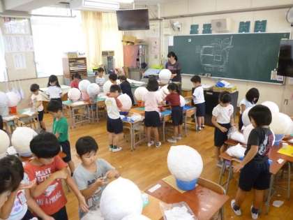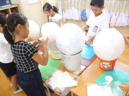とても真剣な顔で、紙を張り合わせて大きなたまごをつくっていました。