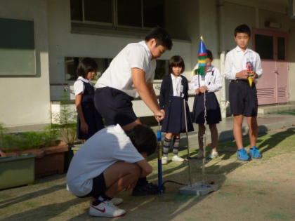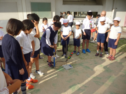 屋外運動クラブの子どもたちも,安全のためにゲームを中断。どれだけ飛ぶかな?と期待して空気を入れました。