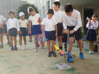 科学クラブでは,班で協力して500mlペットボトルを使って,ペットボトルロケットをつくり,空気入れで空気を入れて飛ばしました。