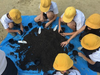 今日は、プラグに入った苗をビニールポットに植え替えです。たてわり班で高学年の子が低学年の子に教えてあげながら、みんなで上手に植え替えることができました。