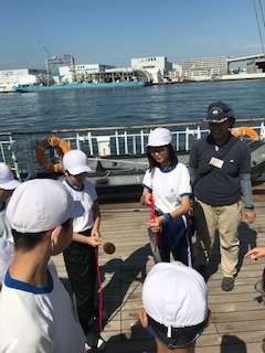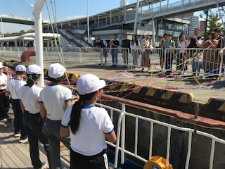 お見送りに来て頂いた保護者の方ともここでお別れです。銅鑼の音に合わせてさあ出航!