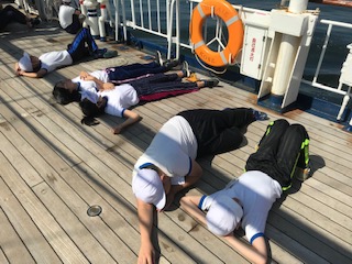船内探検を終えてちょっと休憩。デッキで寝転がると気持ちいい!