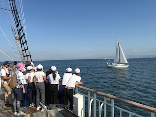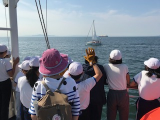 2年前まで豊崎小学校に勤務されていた先生がみんなに会いに来てくれました。どの子も手を振って大喜び。お互いの安全な航行を祈って旗をあげました。