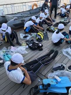 明日のシュノーケリングに備えて、実際にウェットスーツを着てみています。スムーズな着脱ができるようにしましょう。