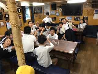 波が少し高かったですが、どの子も無事に楽しくシュノーケリングをすることができました。帰船すると、スタッフの方がプールにお湯をはっておいてくださり、冷えた体を温めることができました。昼食前の休憩時間を使って昨日習ったロープワークをしています。
