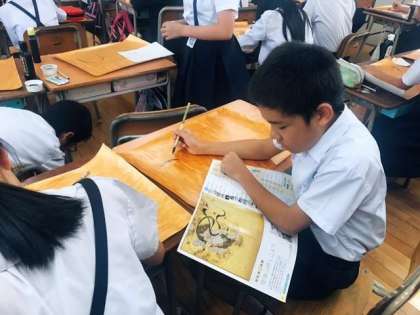 金色の下地を塗った画用紙の上に筆で描いてます。風神雷神をみて作品をまねしたり、自分で考えた風神雷神を描いたりして、自分の思いにあった風神雷神を頑張って制作しています。