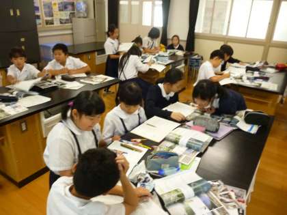 川の様子について、教科書を見ながら気づいたことを班で話し合いました。