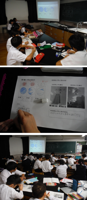 今日は,雲の量と天気について学習しました。雲量によって,天気が決まります。空全体の雲の量を10としたとき,晴れと曇りのちがいはどれぐらいが基準となるか,雲の絵をかきながらみんなで考えました。