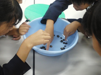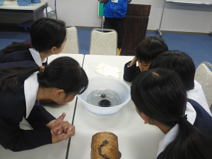 ウニやヤドカリの特性を見て聞いてさわって,体験しながら学習しました。