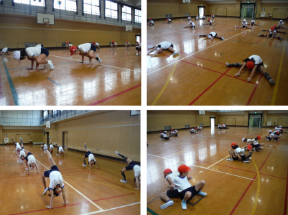 準備運動を念入りにしてから,両手を伸ばして肩回し,片足をあげて床につかずに曲げ伸ばしするスクワット,だるま倒立や柔軟運動,ブリッジ,2人1組で両足ジャンプや体ほぐしの運動など組み合わせて体を温めました。