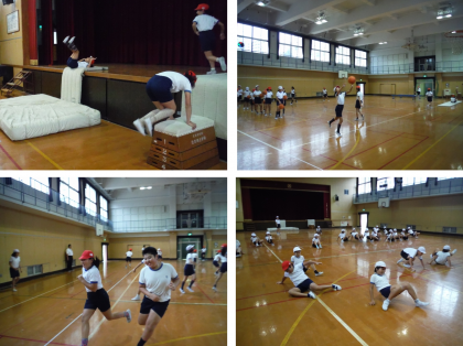 今日は両手をついて跳び箱をジャンプし,体育館のステージにのぼり前転で降りる場や,バスケットゴールにシュートする場,マット運動をする場,バランスよく平均台を移動する場,反復横跳びを40ポイント分リズムよく跳躍する場を設定して,スタート。
