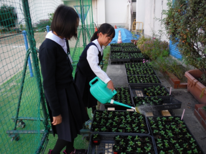 10月7日に全学年で植えたプラグ苗に,毎朝子どもたちが水やりをしています。