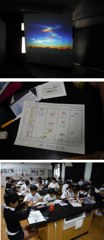 さて,昨日の復習。10種類に分類した雲の画像をフラッシュカードのように見せながら,雲の名前を言い当てました。みんなよく覚えましたね。