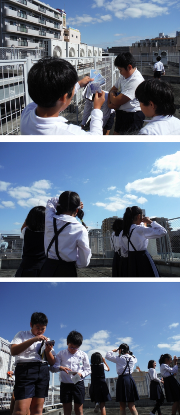 覚え方を学習した後は,屋上にのぼって今日の雲の観察。カードをめくりながら,