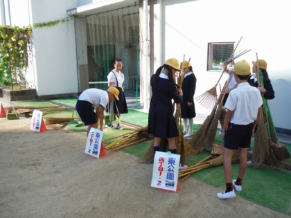 6年生が中心となって,今日のふれあい清掃で使う道具を4階から運動場に運びました。