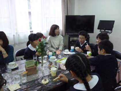 ふれあい喫茶で、6年生は、10月に行った修学旅行の報告と、リコーダー「やさしさに包まれたなら」の演奏をしました。