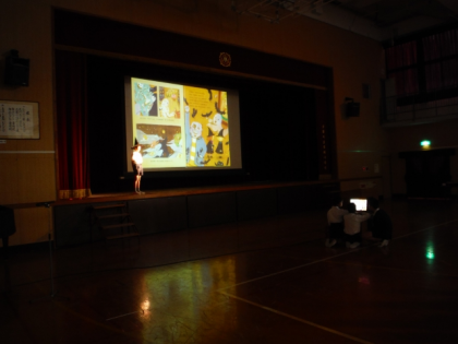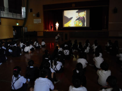 ハローウィンが近いこともあり,『ハロウィンのランプ』という絵本をプロジェクタに投影しながら絵本を読みました。