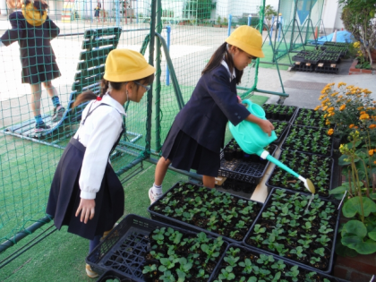 水やりしている子どもたちや,そのようすを見に来た友だちも,すくすくと育っている花苗を見て,その成長ぶりに驚いていました。