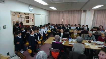 出来上がったおいもチップを、1、2年生みんなで近くの豊崎会館までお届けしました!