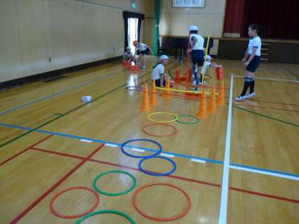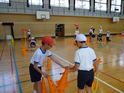 体育館にあるさまざまな用具を使って、アスレチックコースを作りました。