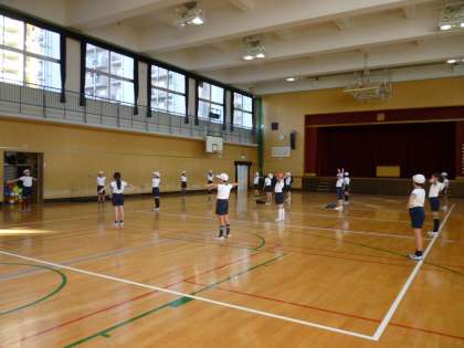 先生が来るのを待ちきれずに、自分たちで準備体操を始めていました。