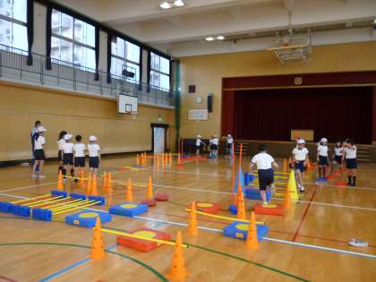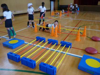 ジャンプしたり、くぐったり、通りぬけたり、またいだり、バランスをとって歩いたり、横歩きをしたり………