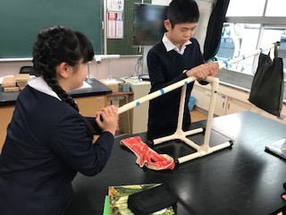 今日はこの3点間の距離を変えるとどうなるかを確認しました。同じ重さであっても距離を変えることで重さは全然違うことを体で感じることができました。