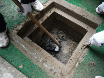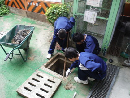 管理作業員さんの仕事を体験しています。開所(側溝)の土揚げとボウフラ対策の網張り,熊手の修理と落ち葉の清掃,理科室のパッキン修理など行いました。