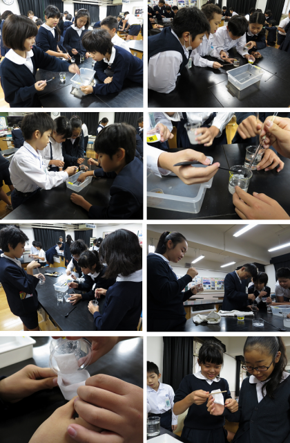 ということを確認して,食塩やコーヒーシュガーが水にとけていくようすを観察しました。