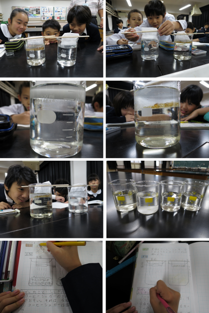コーヒーシュガーは,なかなかとけませんでしたが,水が茶色に変わっていきます。授業時間の終わりには,溶けていましたね。