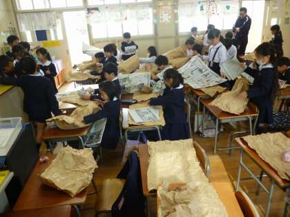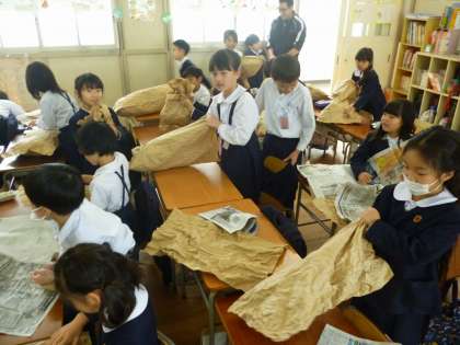 クラフト紙に新聞紙をくしゃくしゃにしてつめます。