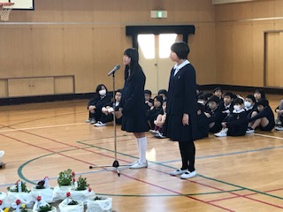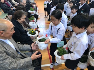 10月に縦割り班で植えた苗が大きくなり、今日地域の皆様にプレゼント式を行いました。みんなで育てた花で豊崎地域がいっぱいになるといいですね。