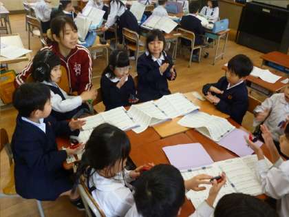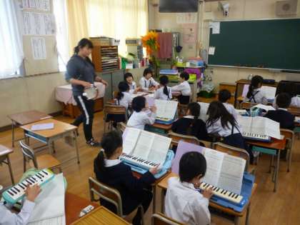 カスタネット、鍵盤ハーモニカを使って、グループに分かれて練習をしていました。