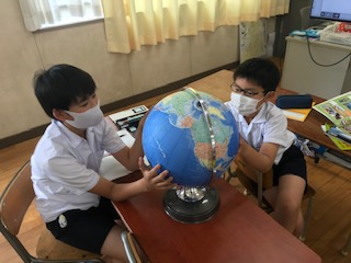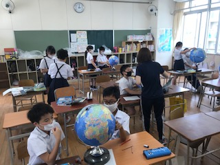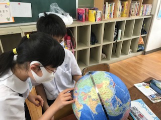 今日は地球儀を使い方を学習する中で日本と他国の位置関係を確認しました。