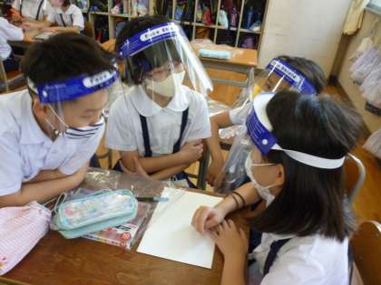 フェイスシールドをつけて、熱心に話し合い、係の表を完成させることができました。