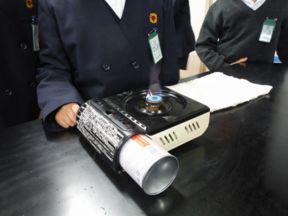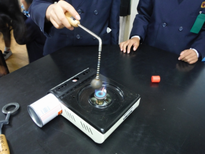 新しい実験道具としてガスコンロを使用した。ガスボンベをセットして,スイッチをひねる。ボッと火がつく。初めて使った子も多かった。家庭では電磁調理器が多くなったのかもしれない。
