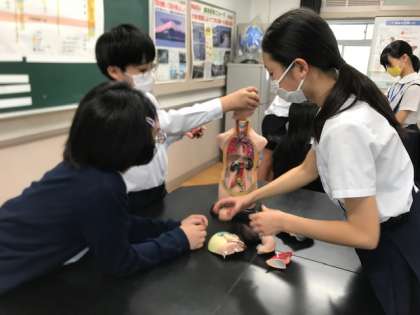 ヒトの体のつくりの勉強をしています。人体模型を使って「肺はここで、心臓は…」と、みんな模型を組み立てるうちに、どこにどの臓器があるか理解してました!