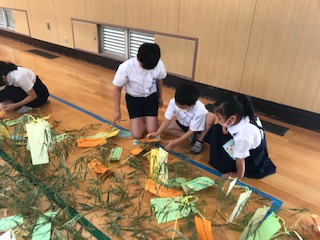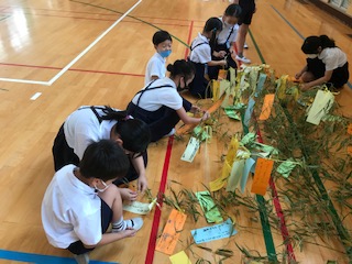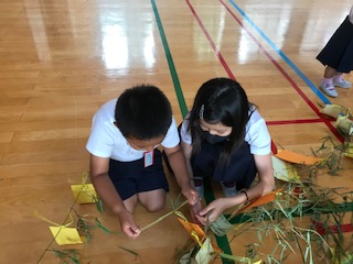 七夕飾りを6年生に手伝ってもらいながらつけました。みんなの願い事が叶うといいですね。6年生もいつもより大人びて、優しく見えましたよ。