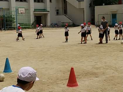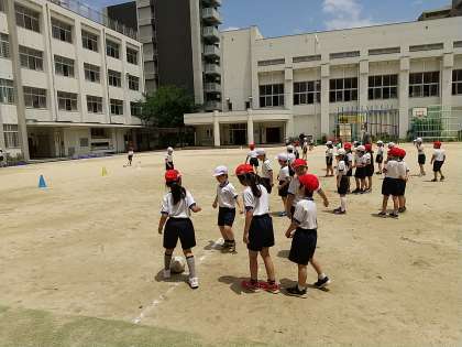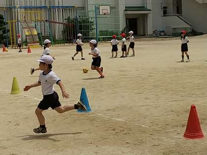 今日は天気も回復し、子どもたちは、運動場で元気よく活動していました。そんな中、二年生は、お腹がすきはじめる四時間目にもかかわらず、体育の時間、ボールけりあそびで元気よく活動していました。