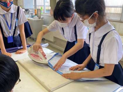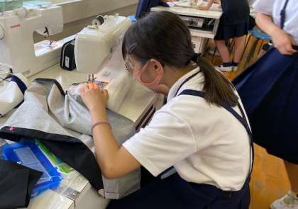 班の友達と協力してミシンで縫う所をアイロンがけしたり、ミシンで縫ったりして制作しています。