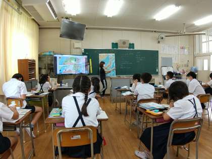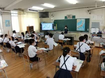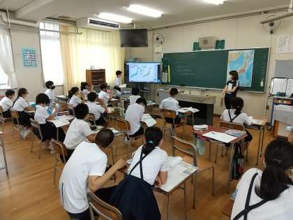 五年生は、「夏に降水量が多いところ、冬に降水量が多いところは、日本のどこ?その理由は?」を学習していました。地形や季節風などから、話し合って、探っていました。