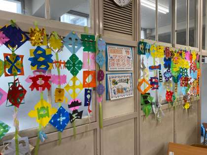 並べ方を考えながら、紙テープに貼り付けて、教室の窓に飾りました。