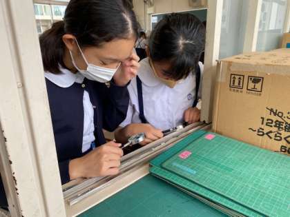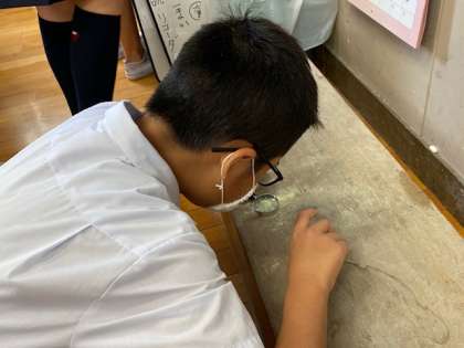 家庭科では、身の回りのよごれについての学習をおこなっています。身近な教室や家庭科室のよごれについて虫メガネを使って詳しく調べていきました。