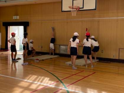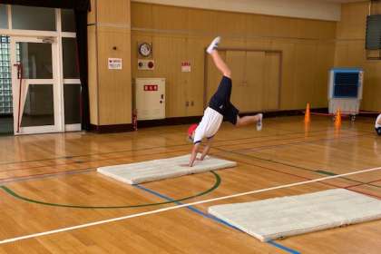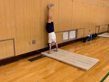 側転をするためには、壁倒立で倒立の姿勢しっかり覚えて、側転の練習に取り組みました。久しぶりの倒立にみんな悪戦苦闘していましたが、上手くできる人がアドバイスをして倒立の感覚をとりもどしていました。