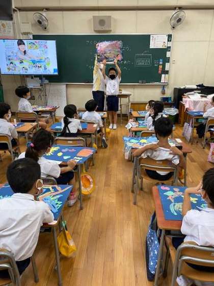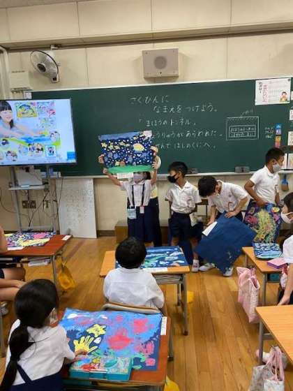今日は、自分の作品の題名を考えて、みんなの前で発表しました。