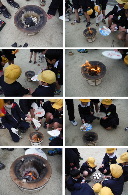 社会科の「昔からのこる,くらしの道具」で,昔の道具について学習しています。その一環として,七輪で炭に火をつけてお餅を焼く体験をしました。