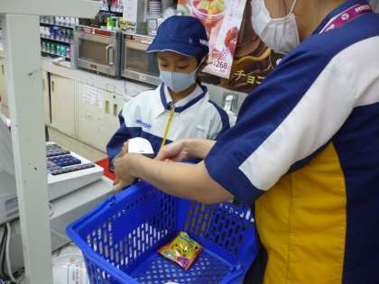 ミニストップでは、店員のみなさんと同じユニフォームを着て、店員のみなさんに優しく教えていただきながら、レジ打ち体験をしました。店内も案内していただき、わかりやすく説明をしていただいて、子どもたちは、目を輝かせながら、見学カードにわかったことをたくさんメモしていました。お土産に、アイスクリームの無料券までいただいて、子どもたちは大喜びでした。
