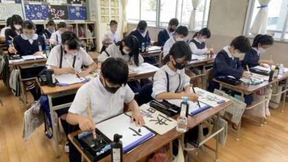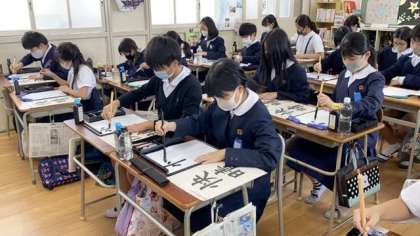 みんな真剣に集中しながらお手本をしっかり見ながら「快晴」の文字を書いていました。