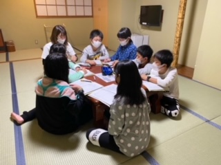 お風呂から上がり、班長会議です。今日の反省と、明日の予定を確認しています。