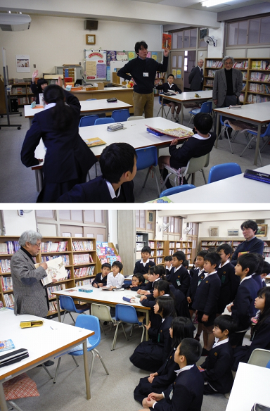 図書室で読書をしていた4年生が,『じごくのそうべえ』の作者の田島先生が来校されていることを知ると,
